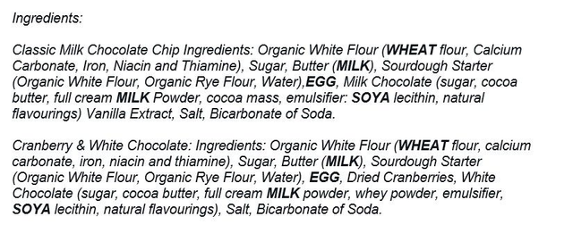 Cranberry & White Chocolate: Ingredients: Organic White Flour (WHEAT flour, calcium carbonate, iron, niacin and thiamine), Sugar, Butter (MILK), Sourdough Starter (Organic White Flour, Organic Rye Flour, Water), EGG, Cranberries, White Chocolate (sugar, cocoa butter, full cream MILK powder, whey powder, emulsifier, SOYA lecithin, natural flavourings), Salt, Bicarbonate of Soda.